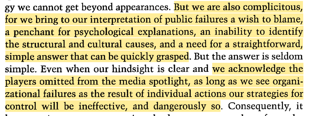 · “as long as we see organizational failures as the result of individual actions our strategies for control will be ineffective, and dangerously so”
