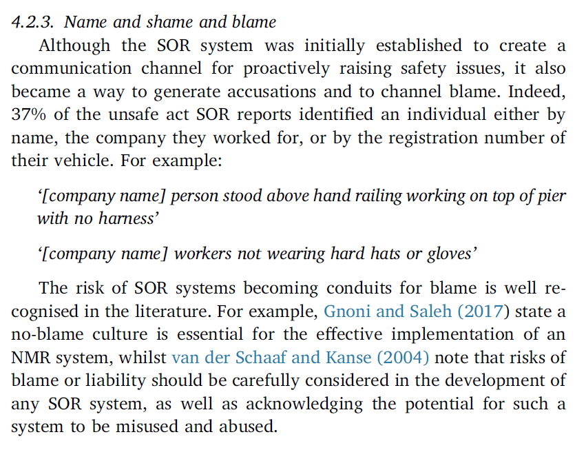 Authors note that SOR and other systems “becoming conduits for blame” is recognised across the literature” (p43). Interestingly, the use of SOR didn’t just stop at blame but rather had become a tool for individuals or companies “to ‘fire shots’ at each other’s safety practice, naming both individuals and organisations”, which ensured blame was appointed (p43). The H&S team was said to be frustrated by the backstabbing which was traceable through the SOR.