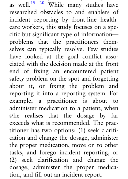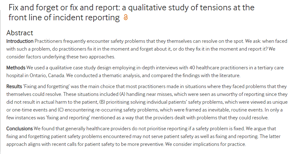 Ref: Hewitt, T. A., & Chreim, S. (2015). Fix and forget or fix and report: a qualitative study of tensions at the front line of incident reporting. BMJ Quality & Safety, 24(5), 303-310.