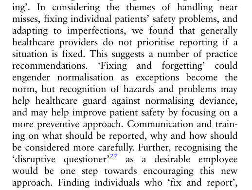 · Generally, healthcare providers in this sample don’t prioritise reporting if a safety problem is fixed, but that “fixing and forgetting patient safety problems encountered may not serve patient safety as well as fixing and reporting”