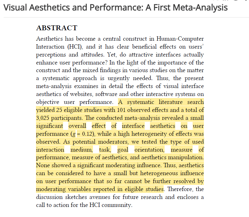 Ref: Thielsch, M. T., Scharfen, J., Masoudi, E., & Reuter, M. (2019). Visual aesthetics and performance: A first meta-analysis. In Proceedings of Mensch und Computer 2019 (pp. 199-210).