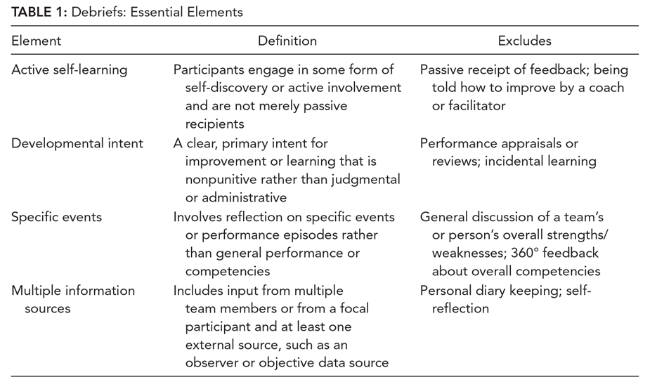 · Debriefs facilitate individuals through a series of questions, allowing people to reflect on recent experience, “construct their own meaning from their actions, and uncover lessons learned in a nonpunitive environment”