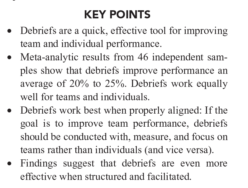 Debriefs were found to be a “potentially powerful yet simple tool to improve the effectiveness of teams and individuals”.