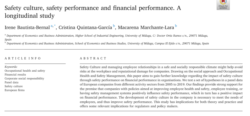 Ref: Bautista-Bernal, I., Quintana-García, C., & Marchante-Lara, M. (2024). Safety culture, safety performance and financial performance. A longitudinal study. Safety science, 172, 106409.
