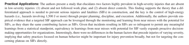 · Results indicate that “the control of high-energy hazards through effective work planning, discipline, and execution is vital for targeting SIFs, supporting the theory that a differentiated approach is needed to avoid the concerning plateau in the rate of construction fatal injuries”