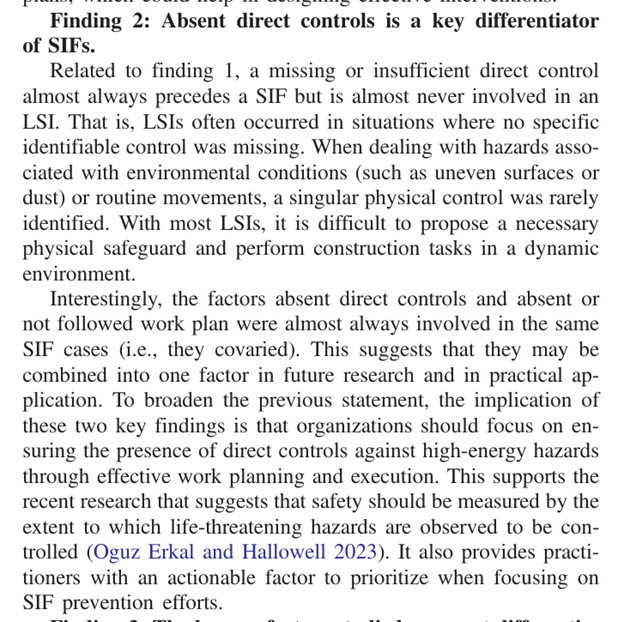 They argue that this suggests “although human factors are prevalent causal factors of injuries, they are not differentiators of SIF”. Hence, “generalized safety practices that focus on human behavior might be important for injury prevention broadly, but that they may not help to target SIFs directly”.
