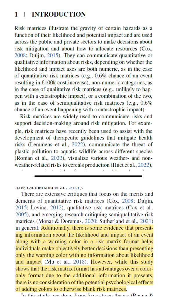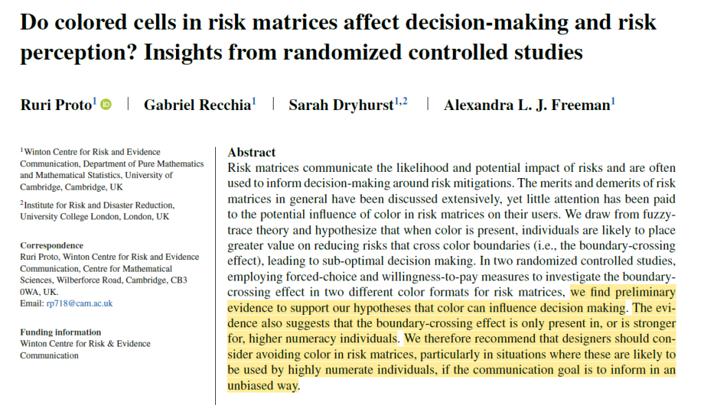 Ref: Proto, R., Recchia, G., Dryhurst, S., & Freeman, A. L. (2023). Do colored cells in risk matrices affect decision‐making and risk perception? Insights from randomized controlled studies. Risk analysis, 43(10), 2114-2128.