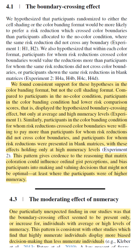 · The “boundary-crossing effect is only present in, or is stronger for, higher numeracy individuals. We therefore recommend that designers should consider avoiding color in risk matrices, particularly in situations where these are likely to be used by highly numerate individuals, if the communication goal is to inform in an unbiased way” [** specific bias reduction is probably more accurate]