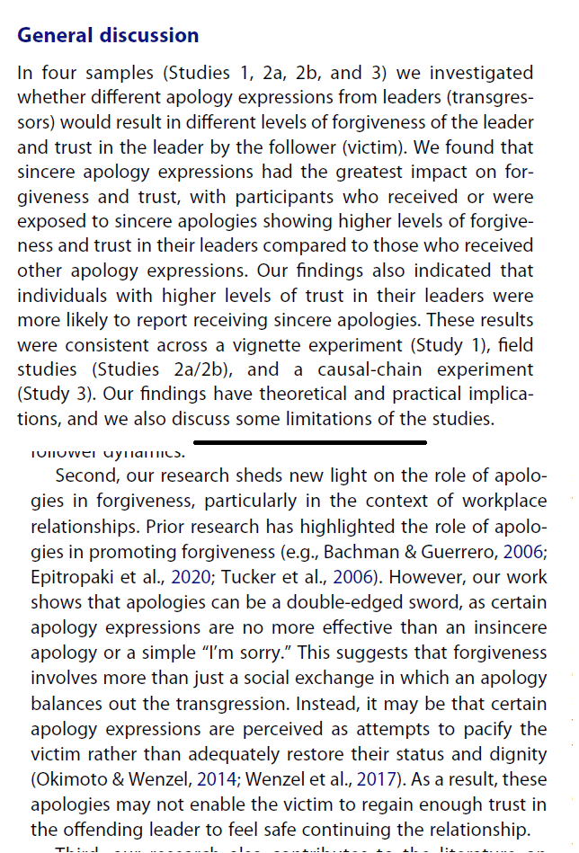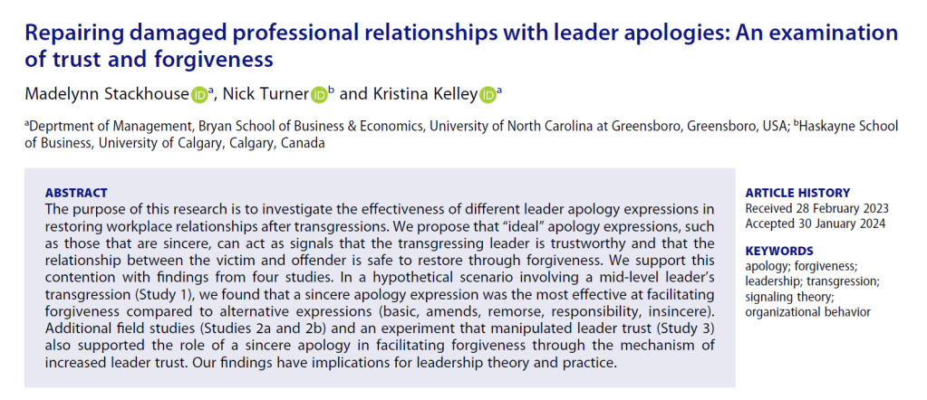 Authors: Stackhouse, M., Turner, N., & Kelley, K. (2024). Repairing damaged professional relationships with leader apologies: An examination of trust and forgiveness. European Journal of Work and Organizational Psychology, 33(3), 399-415.