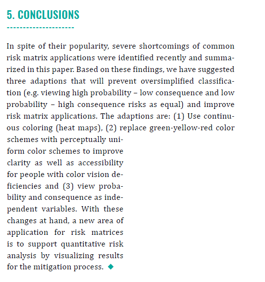 Ref: Entacher, M., & Sander, P. (2018). Improving risk matrix design using heatmaps and accessible colors. The Journal of Modern Project Management, 6(1).