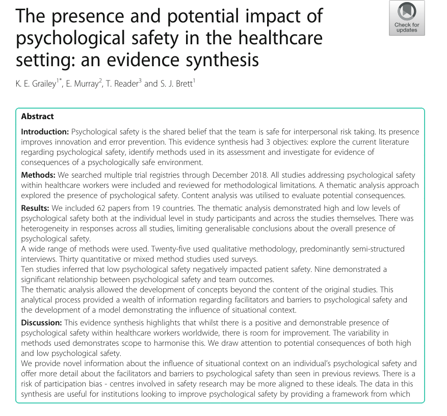 This 2021 evidence synthesis study on psychological safety in healthcare may interest people.