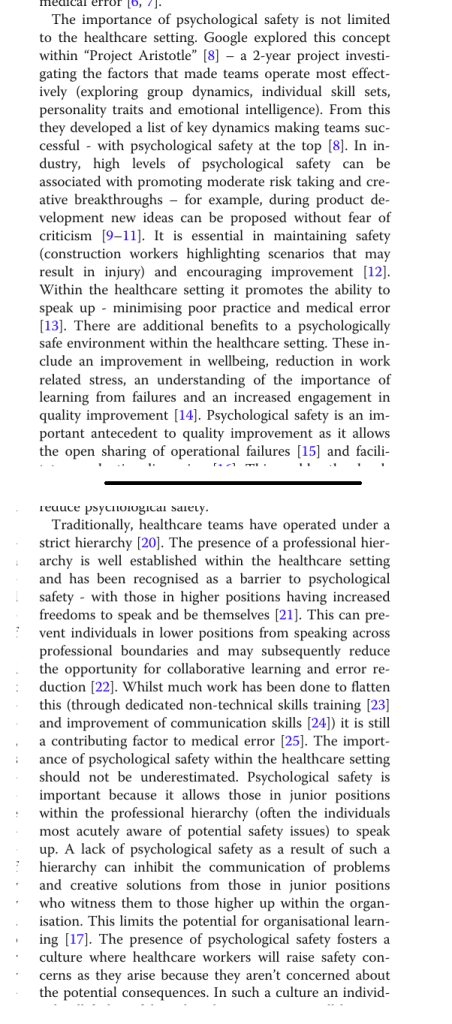 “Individuals possessing high levels of psychological safety are crucial to effective and safe healthcare delivery, and also in the promotion of organisational learning”