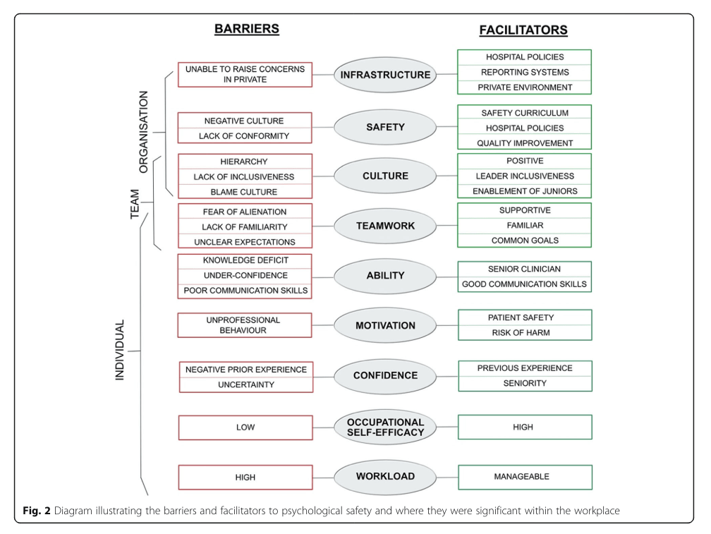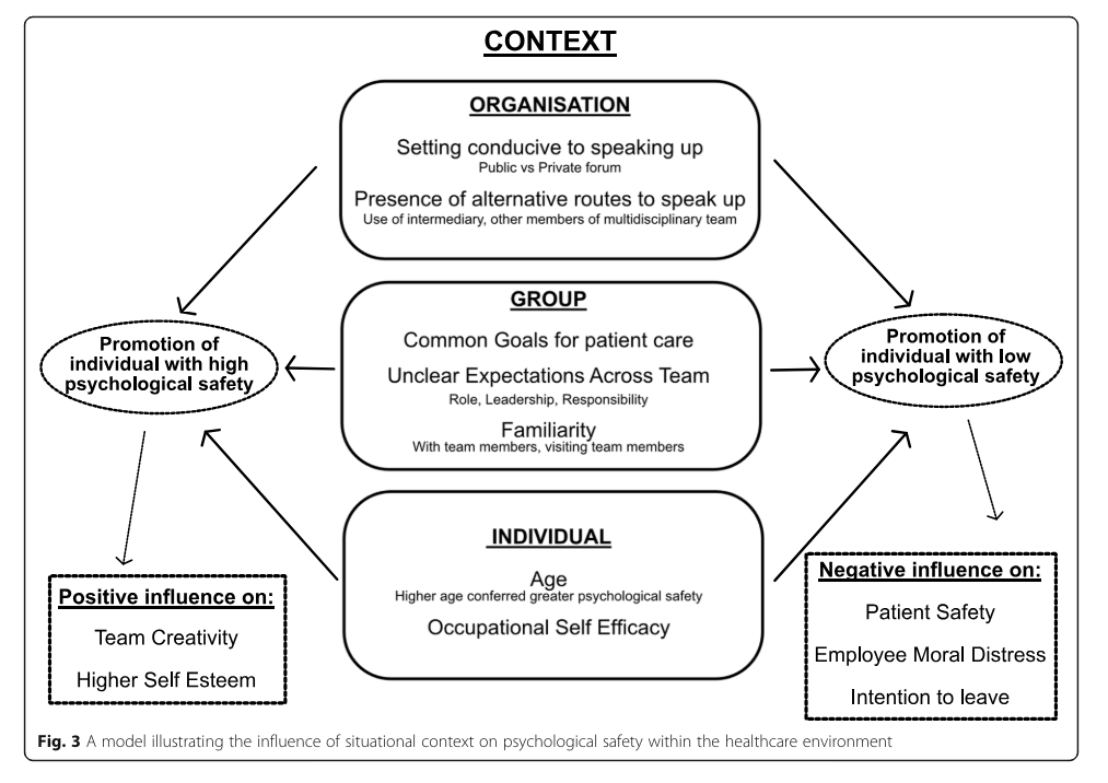 Further, “Organisational culture has an influence on situational context and the consequential perception of a psychologically safe environment. Changing the culture of an organisation, envisaged with a view to improving psychological safety, can be challenging due to the presence of multiple stakeholders and the complexities associated with the healthcare setting”