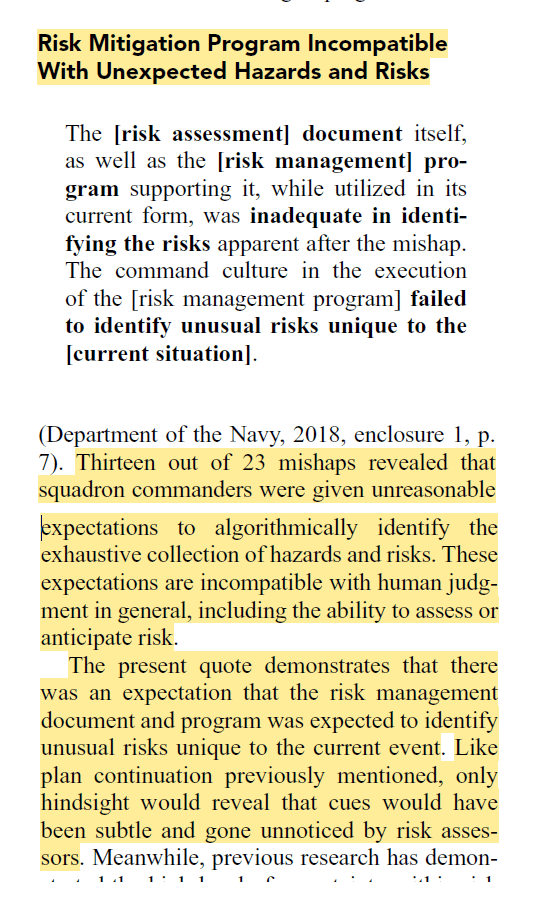 · 13 of 23 mishaps “revealed that squadron commanders were given unreasonable expectations to algorithmically identify the exhaustive collection of hazards and risks”