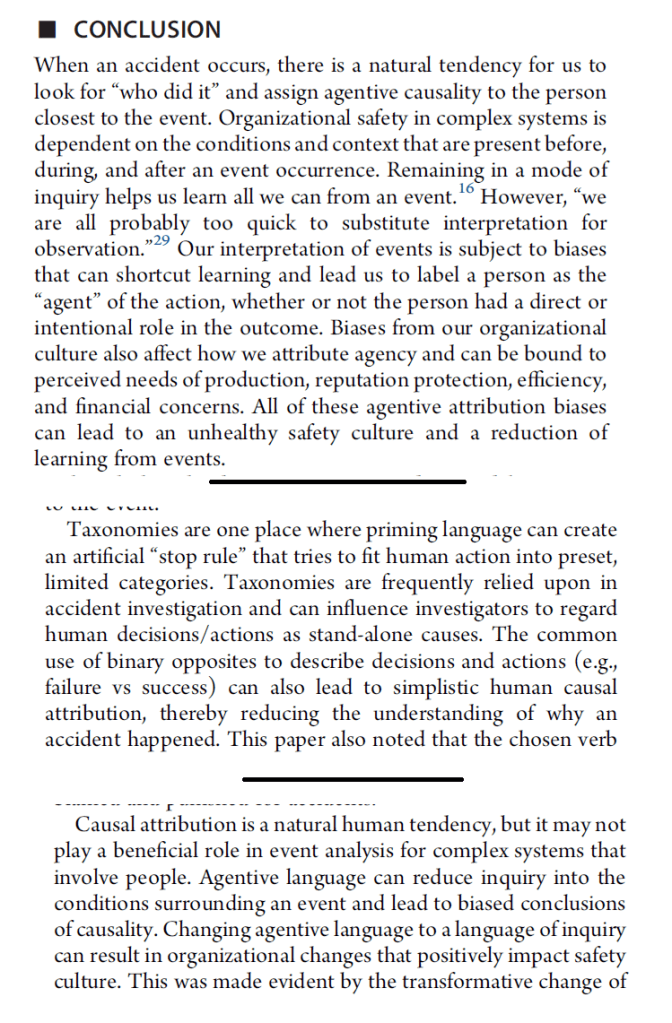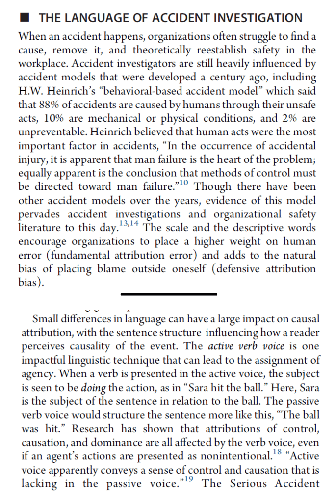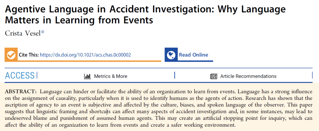 Author: Vesel, C. (2020). Agentive language in accident investigation: Why language matters in learning from events. ACS Chemical Health & Safety, 27(1), 34-39.