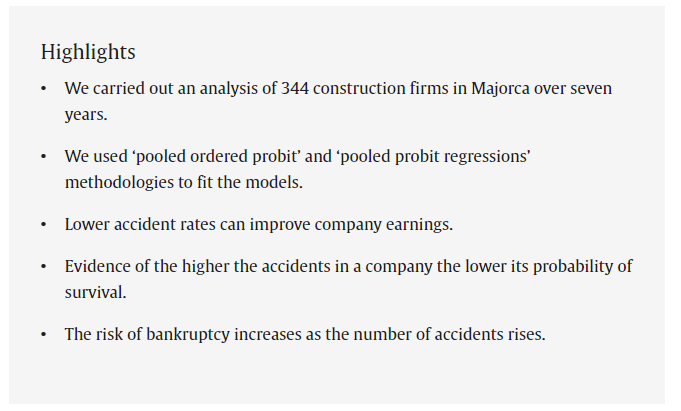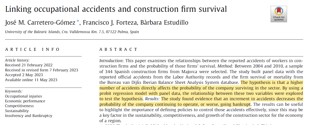 Ref: Carretero-Gómez, J. M., Forteza, F. J., & Estudillo, B. (2023). Linking occupational accidents and construction firm survival. Journal of safety research, 85, 485-491.