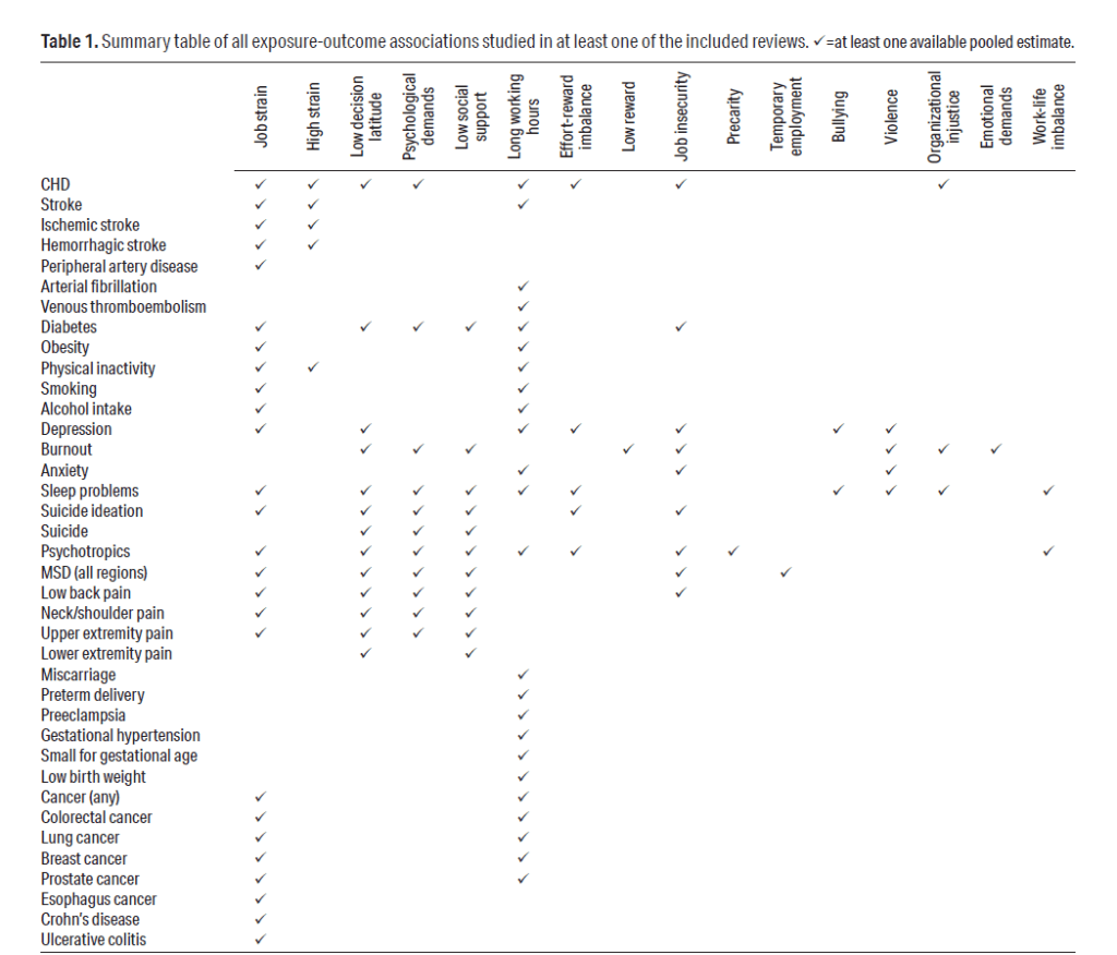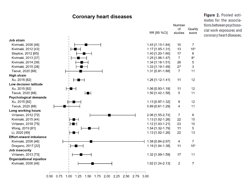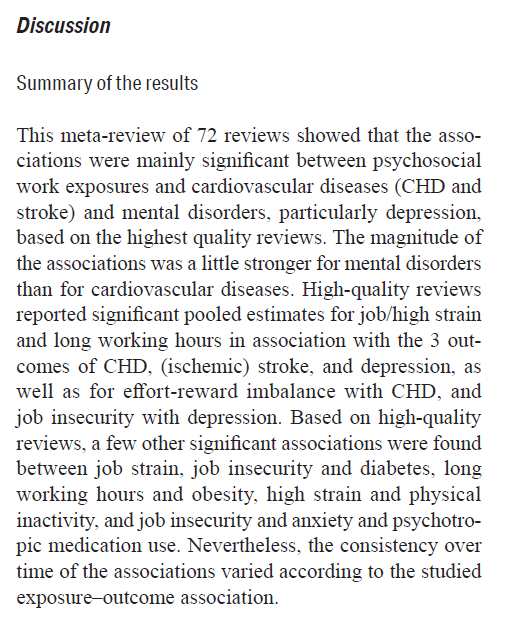 · “This meta-review of 72 reviews showed that the associations were mainly significant between psychosocial work exposures and cardiovascular diseases (CHD and stroke) and mental disorders, particularly depression, based on the highest quality reviews”