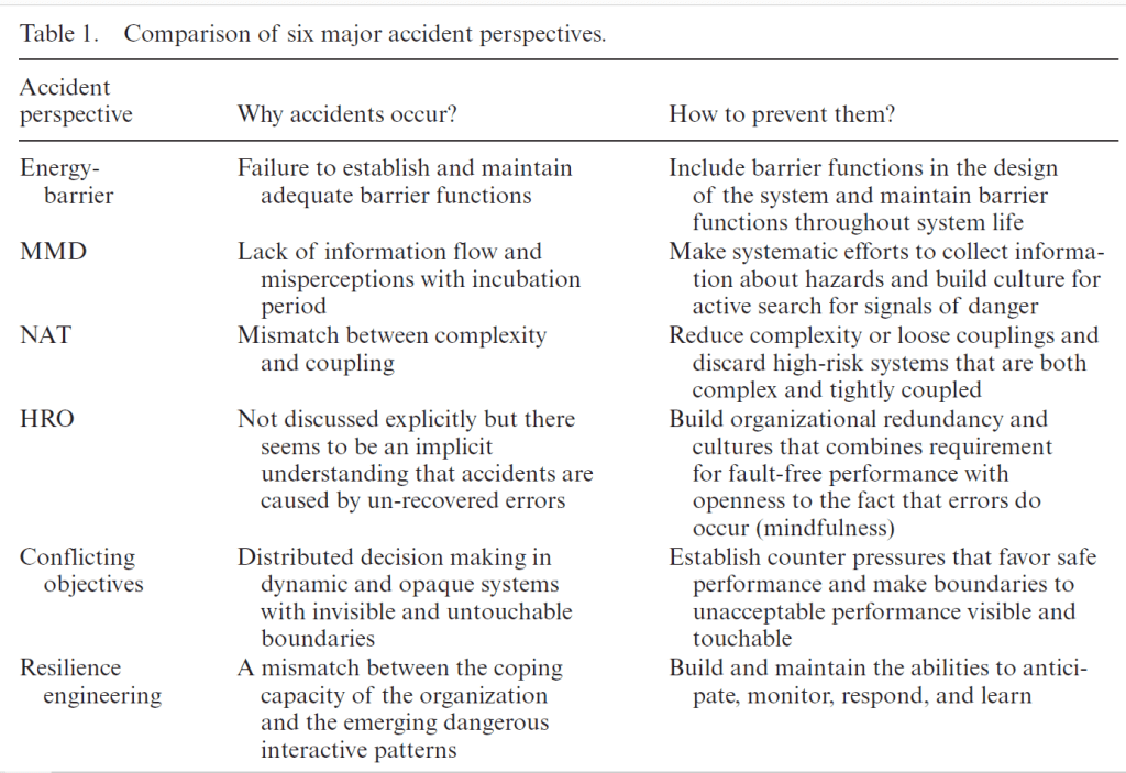 · NAT, HRO and RE were said to be largely relevant to operational factors, while the other perspectives are applicable to both operational and design matters [** I disagree with their summation here]