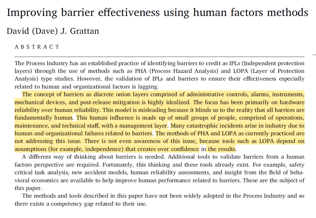 An interesting 2018 paper from Dave Grattan, discussing the importance of human factors in barrier effectiveness.
