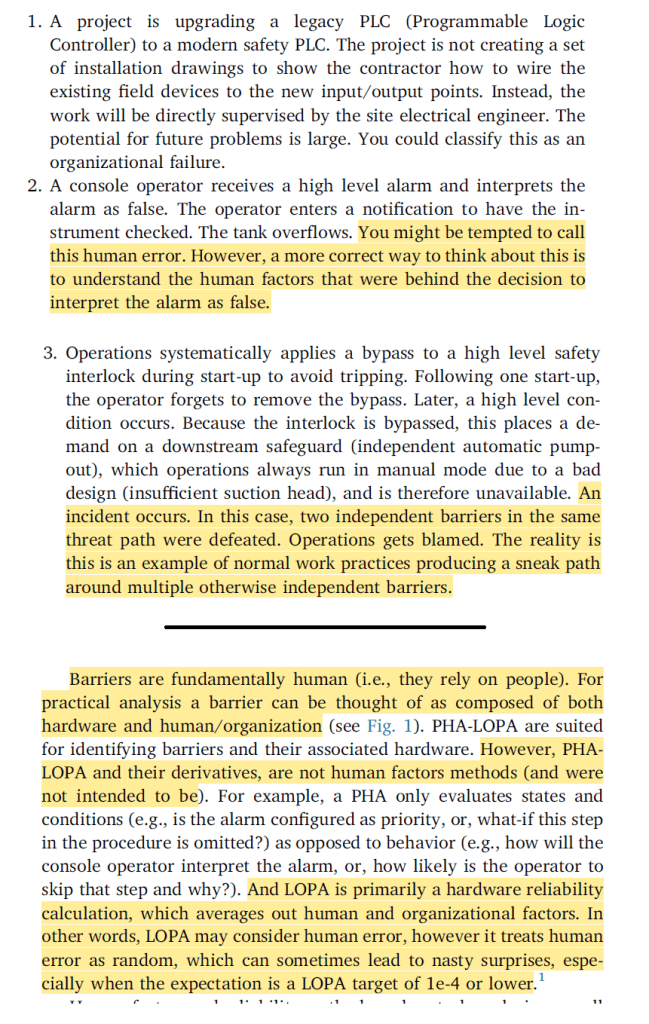 · Methods like PHA and LOPA as “currently practiced are not addressing this issue. There is not even awareness of this issue, because tools such as LOPA depend on assumptions (for example, independence) that creates over confidence in the results”