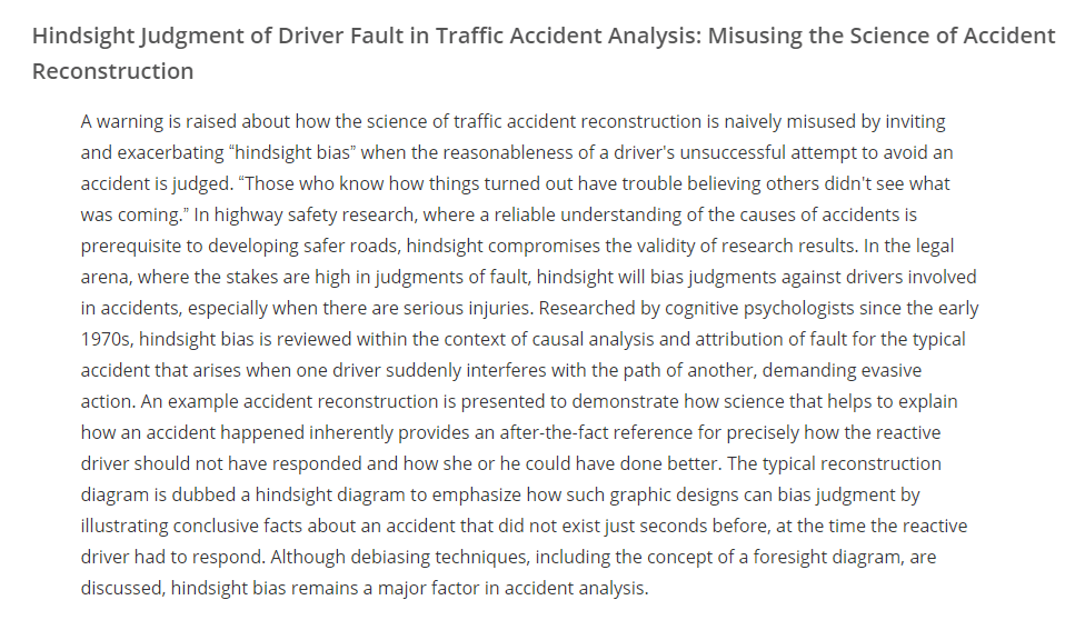 One thought on “Hindsight Judgment of Driver Fault in Traffic Accident Analysis: Misusing the Science of Accident Reconstruction”
