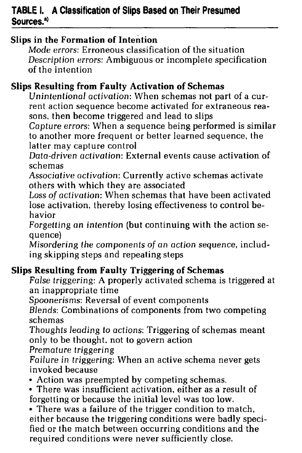 Different classifications of slips exist, but at the basic level and a very simplistic model of human activity, it’s assumed that an intention activates a number of cognitive schemas, each with an activation value and set of triggering conditions.
