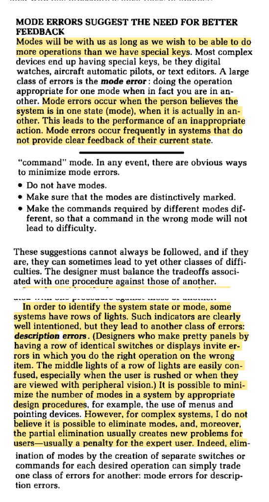 Importantly, “Mode errors occur frequently in systems that do not provide clear feedback of their current state”.