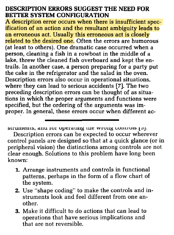 The role of design in description errors “is especially bad in the design of nuclear power plant control rooms, where switches and controls are laid out in neat, logical, nice-looking rows”, which results in “clear potential for confusion, for reading the wrong instruments, and for operating the wrong controls” [Again remembering this is 1983 nuclear plant rooms.]
