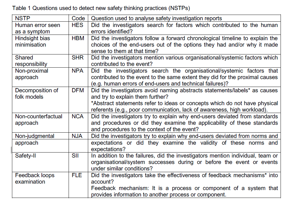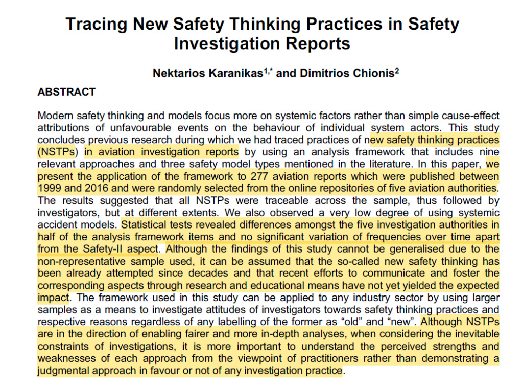 This 2019 paper from Nektarios Karanikas and colleague explored the adoption (or not) of New Safety Thinking Practices (NSTPs) in aviation investigation reports from five aviation authorities.