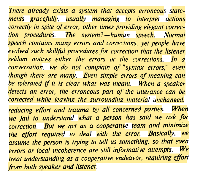 He draws an interesting comparison between system faults and conversation. Conversation is “riddled with speech errors, from incomplete sentences to erroneous choice of words. But certainly we do not expect the people with whom we talk to respond to our speech errors with [condescending fault messages that the user did something wrong].