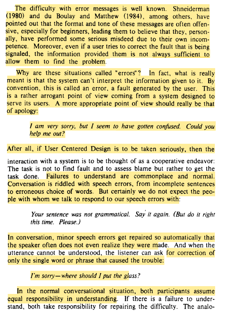 Further, they argue that “The system should do its best to help. If it can figure out what was intended, so much the better. If not, it should explain gracefully where its problem is, perhaps making suggestions”.