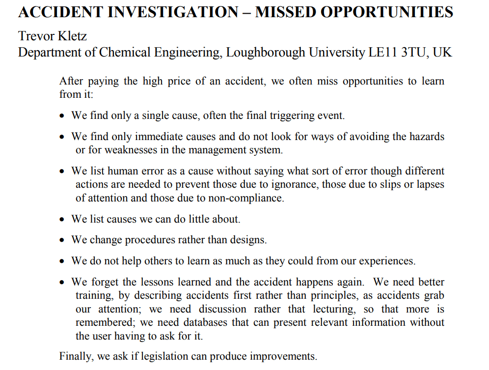Ref: Kletz, T. (2002). Accident investigation—Missed opportunities. In Components of System Safety: Proceedings of the Tenth Safety-critical Systems Symposium, Southampton, UK 2002 (pp. 3-15). Springer London.
