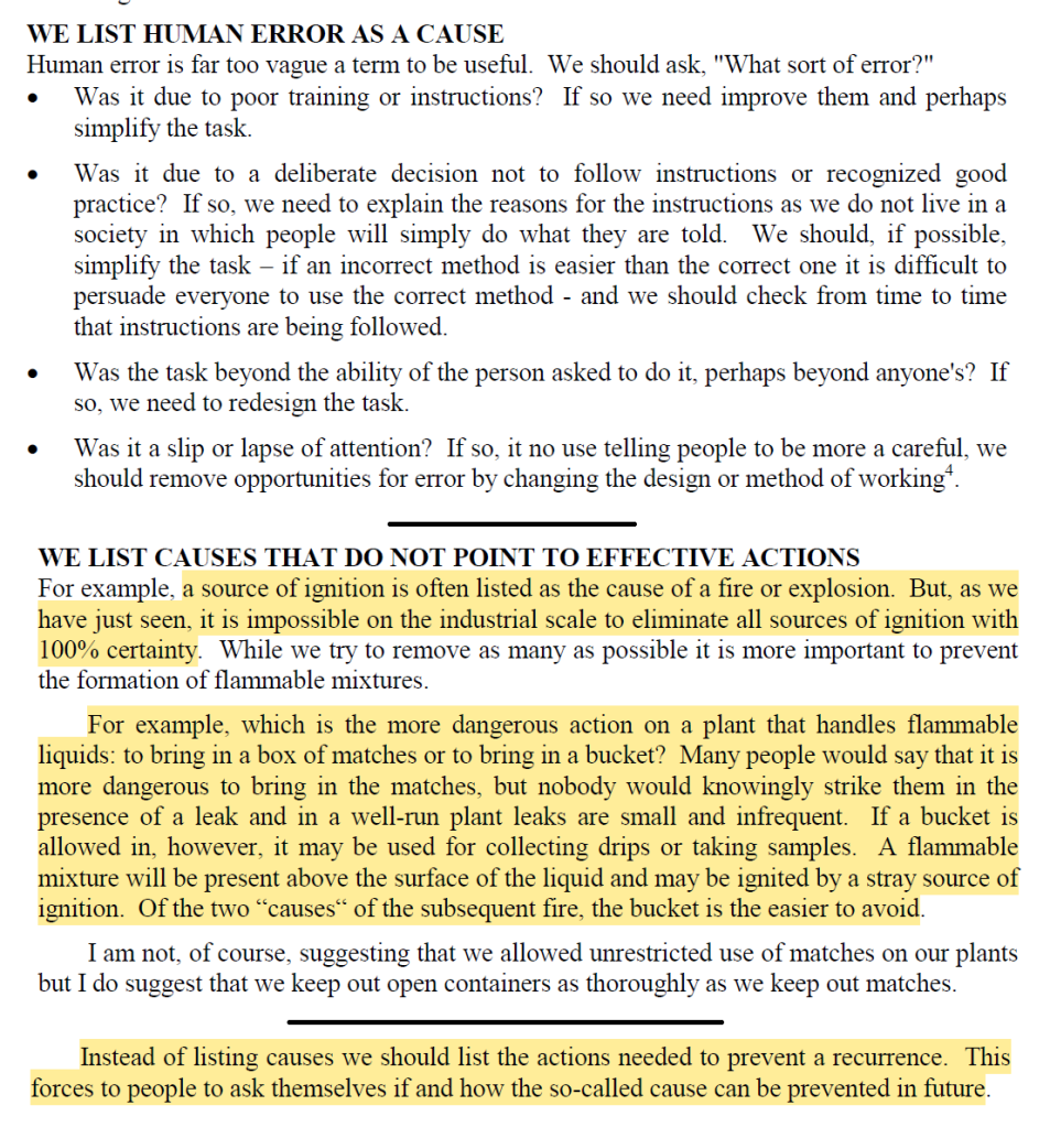 - “Even when we find more than one cause, we often find only immediate causes. We should look beyond them for ways of avoiding the hazards, such as inherently safer design, and for weaknesses in the management system”