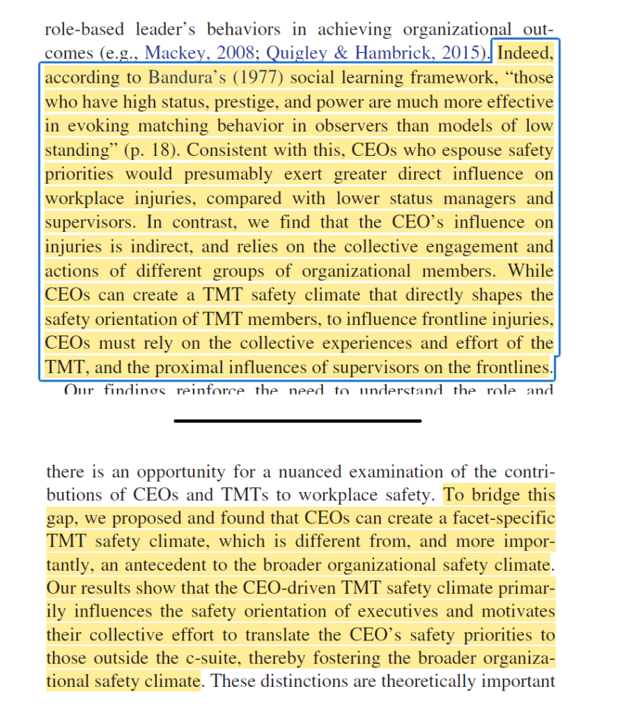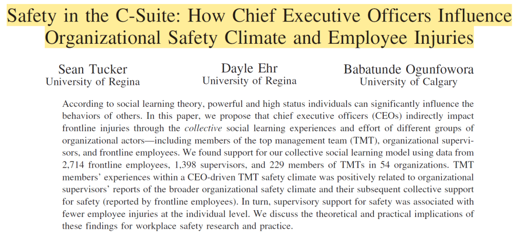 And, “CEO-driven TMT safety climate primarily influences the safety orientation of executives and motivates their collective effort to translate the CEO’s safety priorities to those outside the c-suite, thereby fostering the broader organizational safety climate.