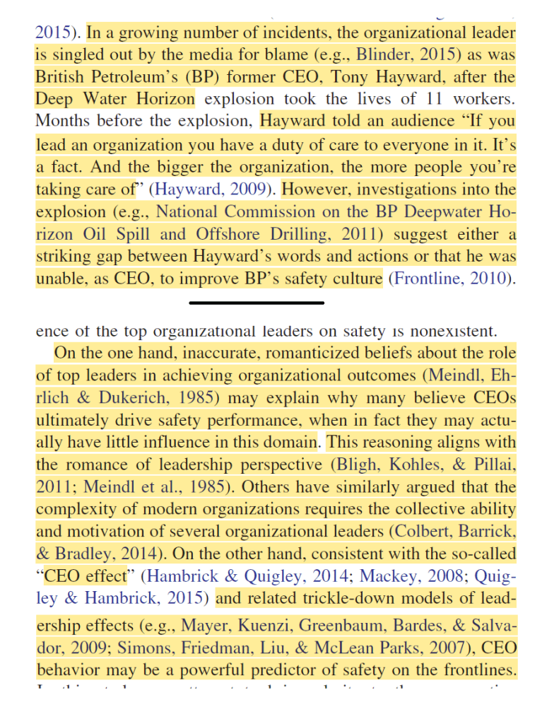 - “This reasoning aligns with the romance of leadership perspective”, nevertheless, “consistent with the so-called “CEO effect” … and related trickle-down models of leadership effects … CEO behavior may be a powerful predictor of safety on the frontlines”
