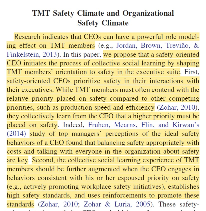 - “safety-oriented CEOs prioritize safety in their interactions with their executives. While TMT members must often contend with the relative priority placed on safety compared to other competing priorities, such as production speed and efficiency (Zohar, 2010), they collectively learn from the CEO that a higher priority must be placed on safety”