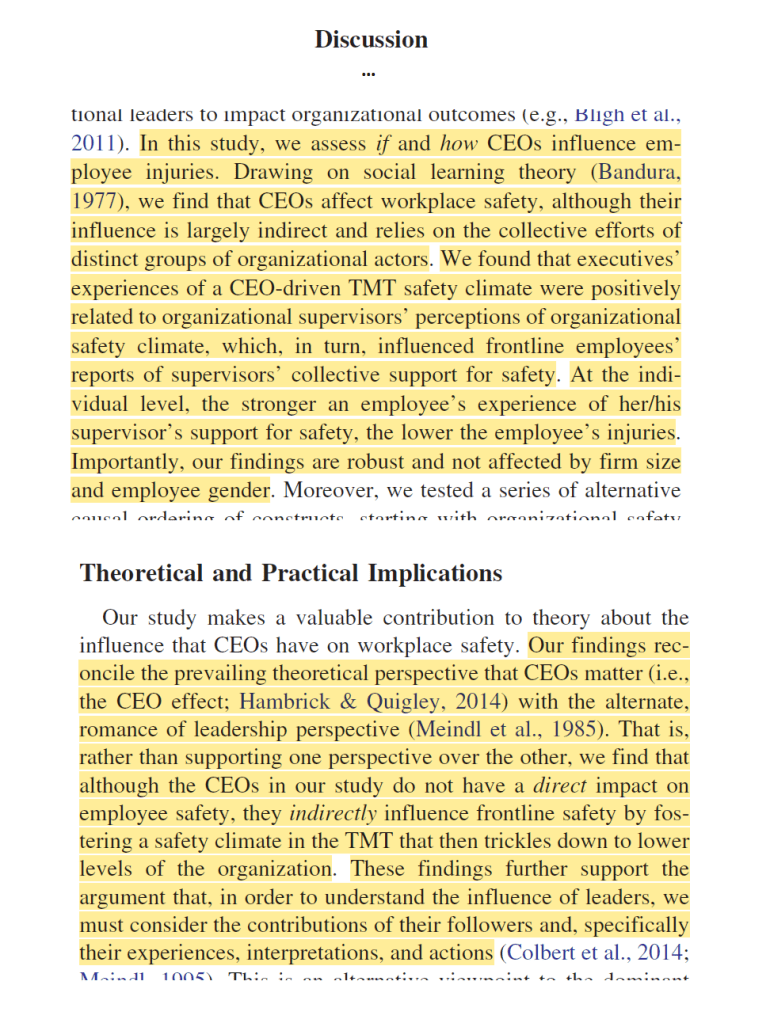 - “CEOs who espouse safety priorities would presumably exert greater direct influence on workplace injuries, compared with lower status managers and supervisors. In contrast, we find that the CEO’s influence on injuries is indirect, and relies on the collective engagement and actions of different groups of organizational members”