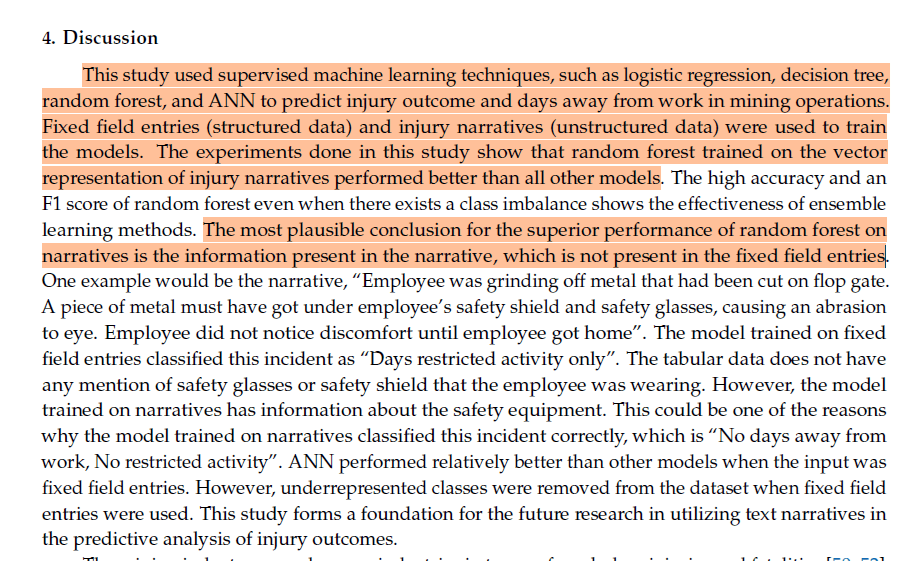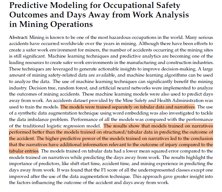 · Nevertheless, “The models trained on tabular data had a lower mean squared error compared to the models trained on narratives while predicting the days away from work”