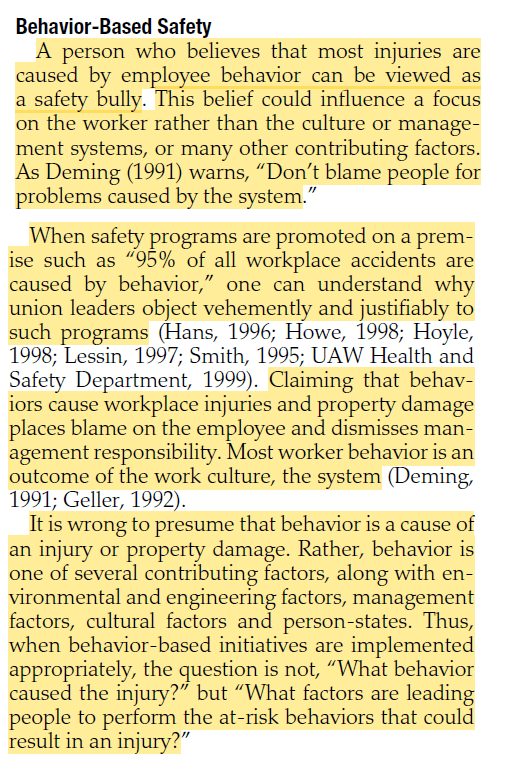 - “As Deming (1991) warns, “Don’t blame people for problems caused by the system When safety programs are promoted on a premise such as “95% of all workplace accidents are caused by behavior,” one can understand why union leaders object vehemently and justifiably to such programs”