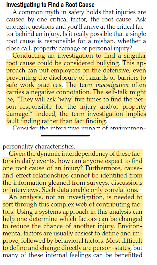 - “Conducting an investigation to find a singular root cause could be considered bullying. This approach can put employees on the defensive, even preventing the disclosure of hazards or barriers to safe work practices”