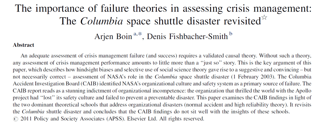 Authors: Boin, A., & Fishbacher-Smith, D. (2011). The importance of failure theories in assessing crisis management: The Columbia space shuttle disaster revisited. Policy and Society, 30(2), 77-87.