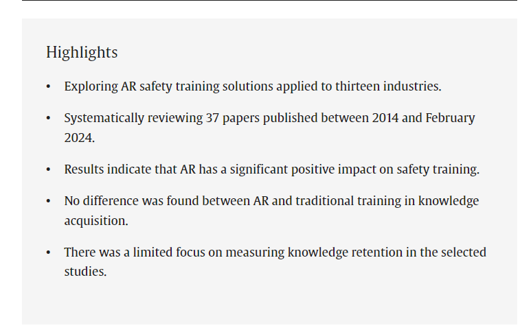 · The meta-analysis “revealed a significant positive effect of AR technology on safety training, demonstrating its substantial impact”
