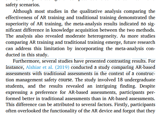 · “several studies have presented contrasting results. For instance, Alshiar et al. (2019) conducted a study comparing AR-based assessments with traditional assessments in the context of a construction management safety course. The study involved 18 undergraduate students, and the results revealed an intriguing finding. Despite expressing a preference for AR-based assessments, participants performed better in traditional assessments than in AR-based assessments”