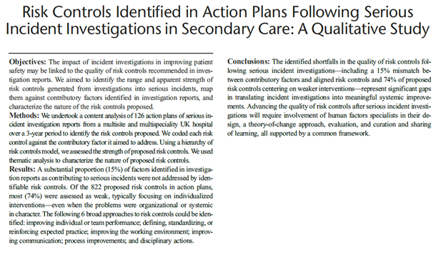 Authors: Peerally, M. F., Carr, S., Waring, J., Martin, G., & Dixon-Woods, M. (2023). Risk controls identified in action plans following serious incident investigations in secondary care: a qualitative study. Journal of Patient Safety, 10-1097.
