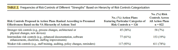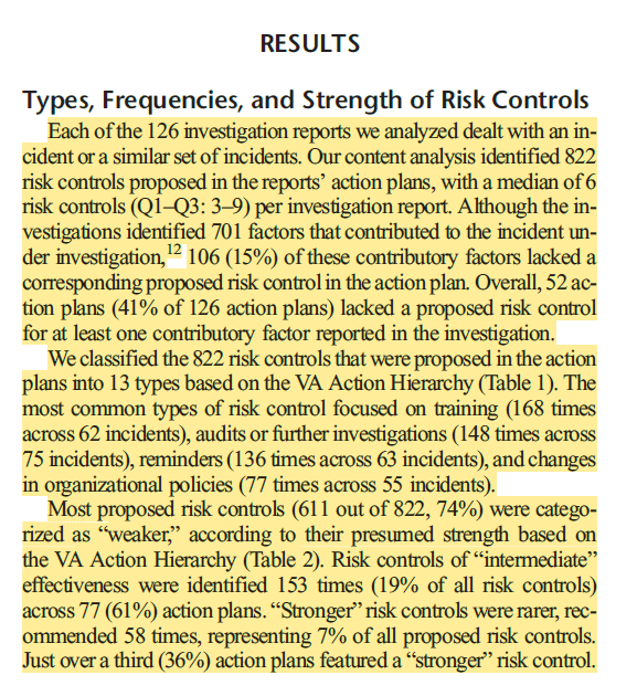 - Of the 822 proposed risk controls in action plans, “most (74%) were assessed as weak, typically focusing on individualized interventions—even when the problems were organizational or systemic in character”