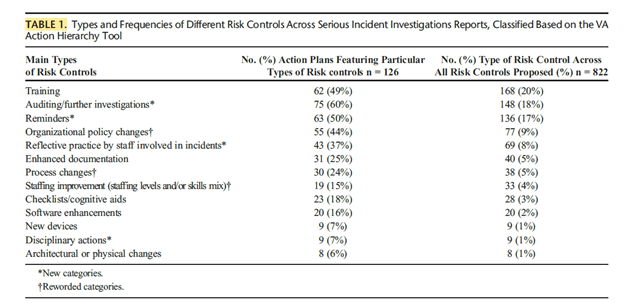 - “.Across 822 risk controls proposed in the action plans of 126 serious incident incidents over a 3-year period, a striking proportion of serious incident investigations reports and action plans (41%) featured contributory factors that went unaddressed by any risk control, and three-quarters (74%) of proposed risk controls were classified “weaker,”with only 7% classified as “stronger”