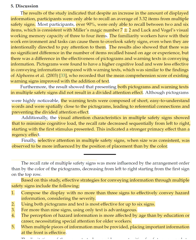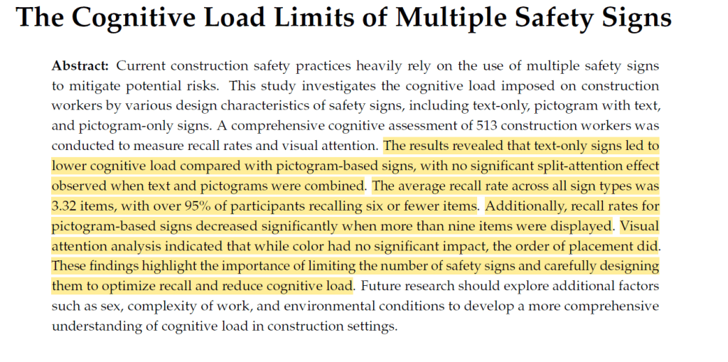 Ref: Kwon, Y. H., Kwon, Y. B., Nwagbala, D. C., & Park, J. Y. (2024). The Cognitive Load Limits of Multiple Safety Signs. Buildings, 14(8), 2391.