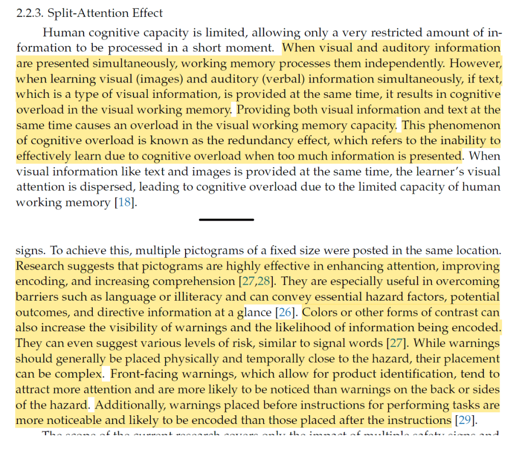 - “presenting both pictograms and warning texts in multiple safety signs did not result in a divided attention effect”