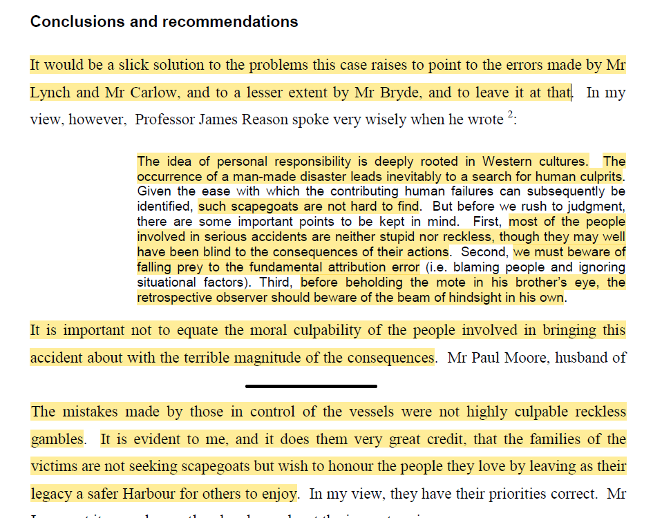 - “Thus while ferry masters were aware anecdotally of the possibility of encountering unlit vessels, there was no corporate response to the issue until this accident happened”