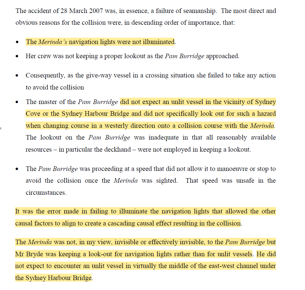 - “Commercial operators on Sydney Harbour at the time of the accident did not routinely and habitually report sightings of unlit vessels to Harbour Control” and “This is not to blame them but to illustrate that reporting sightings was not habitual”